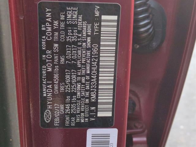 17"""" Alloy Wheels, 4-Wheel Disc Brakes, 8 Speakers, ABS brakes, Alloy wheels, AM/FM radio: SiriusXM, Apple CarPlay & Android Auto, Auto-dimming Rear-View mirror, Automatic temperature control, Brake assist, Bumpers: body-color, Cargo Net, Cargo Tray, Carpeted Floor Mats, Compass, Delay-off headlights, Driver door bin, Driver vanity mirror, Dual front impact airbags, Dual front side impact airbags, Electronic Stability Control, Emergency communication system: Blue Link, Exterior Parking Camera Rear, First Aid Kit, Four wheel independent suspension, Front anti-roll bar, Front Bucket Seats, Front Center Armrest, Front dual zone A/C, Front fog lights, Front reading lights, Fully automatic headlights, Garage door transmitter: HomeLink, Heated door mirrors, Heated Front Bucket Seats w/Power Driver's Seat, Heated front seats, Illuminated entry, Leather Seat Trim, Low tire pressure warning, Mudguards, Occupant sensing airbag, Option Group 01, Outside temperature display, Overhead airbag, Overhead console, Panic alarm, Passenger vanity mirror, Power door mirrors, Power passenger seat, Radio: Infinity AM/FM/HD Radio/MP3 Audio System, Rear anti-roll bar, Rear window wiper, Remote keyless entry, Roof rack: rails only, Security system, Speed control, Speed-sensing steering, Split folding rear seat, Spoiler, Steering wheel mounted audio controls, Traction control, Turn signal indicator mirrors, Variably intermittent wipers.2017 Hyundai Tucson SE Plus